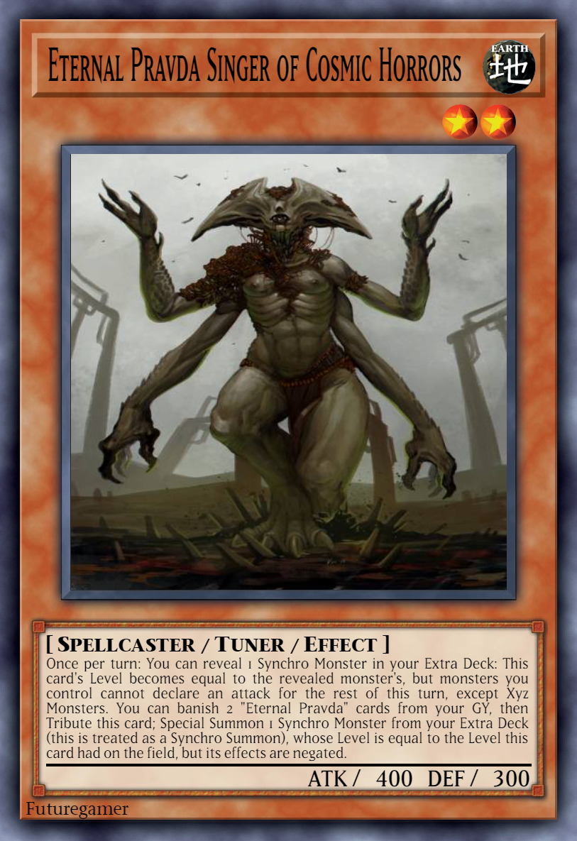 Futuregamer | | #1 | Fri Apr 16, 2021 8:32 AM | | Delete | A surprising hit of a deck (I expected them to need a lot more work to function when designing them), Eternal Pravdas are an EARTH Synchro->Xyz Deck, that benefits from "Black & White Wave" [*:vlxwppl6]"Eternal Pravda" MD monsters can banish 2 "Eternal Pravda" cards from your GY and tribute themselves to free Synchro-Summon a monster with their own level on the field from the ED, but with its effects negated. [/*:m:vlxwppl6] [*:vlxwppl6]All the Synchro "Eternal Pravda"s give +400 on Xyzes that use them as materials and some effect that shuffles cards from the GY into the Deck.[/*:m:vlxwppl6] [*:vlxwppl6]The archetype has effects that trigger when a Xyz Monster causes cards in the GY to be shuffled into the Deck.[/*:m:vlxwppl6] Card list: [url:vlxwppl6]https://www.duelingbook.com/deck?id=7645064[/url:vlxwppl6] Deck example list: [url:vlxwppl6]https://www.duelingbook.com/deck?id=7696124[/url:vlxwppl6] See the rest of my cards at: [url:vlxwppl6]https://futuregamer-yugioh.blogspot.com/2020/09/futuregamers-custom-archetypes-guide.html[/url:vlxwppl6]  |